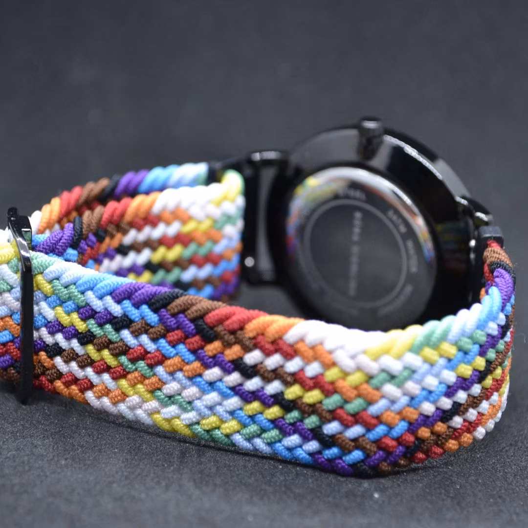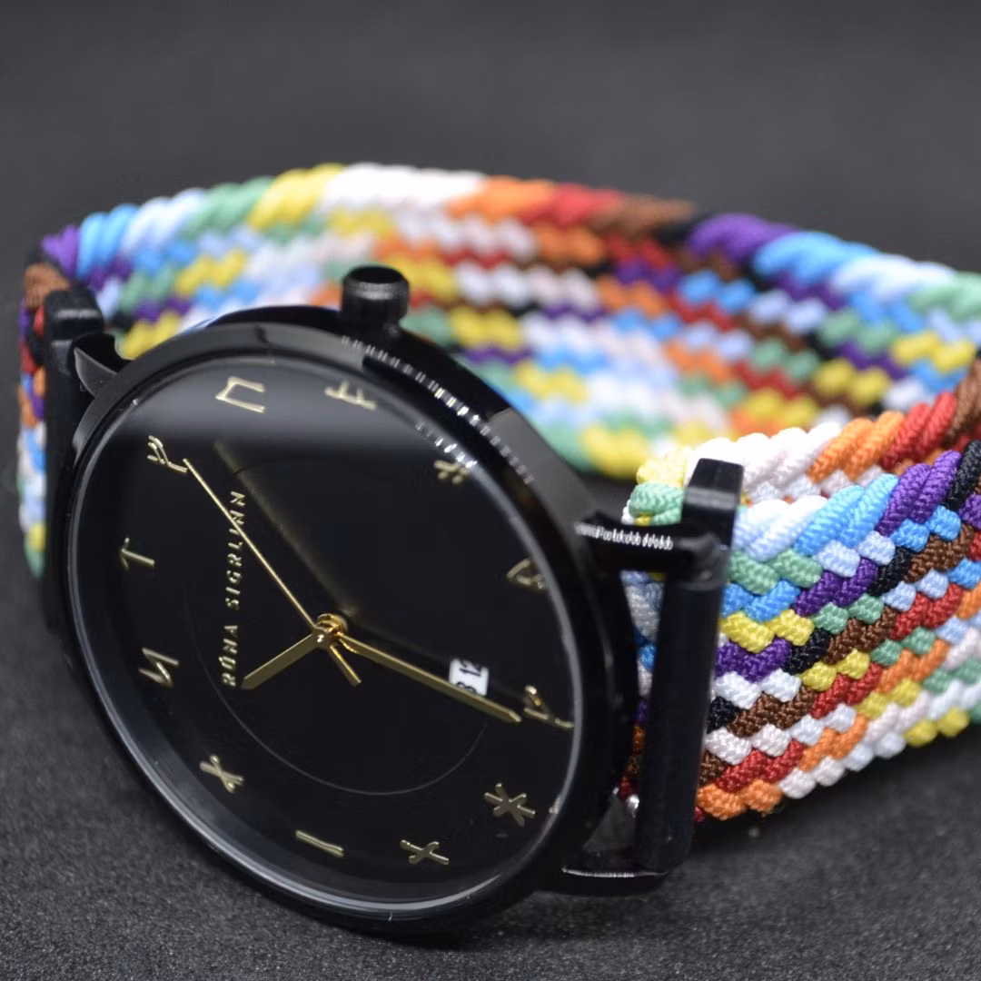 Det färgglada armbandet är det första folk lägger märke till — djärv, färgglad, och designad för att stå ut på håll. Genom att vara stretchig, luftig och skön förkroppsligar den klockans moderna uttryck samtidigt som den balanserar boettens och urtavlans tidlösa stillhet. Armbandet är vävt med elastiska nylontrådar för en skön och luftig känsla på handleden, och justeras enkelt med ett spänne utan att behöva knäppas. Armbandet kan enkelt tas av och bytas beroende på humör och smak.