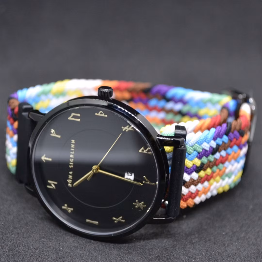 Fe Bifrost har en minimalistisk nordisk design i blankt nattsvart med en slät glasskiva. Dess urtavla bär gyllene visare och runor som symboliserar Gyllentalen