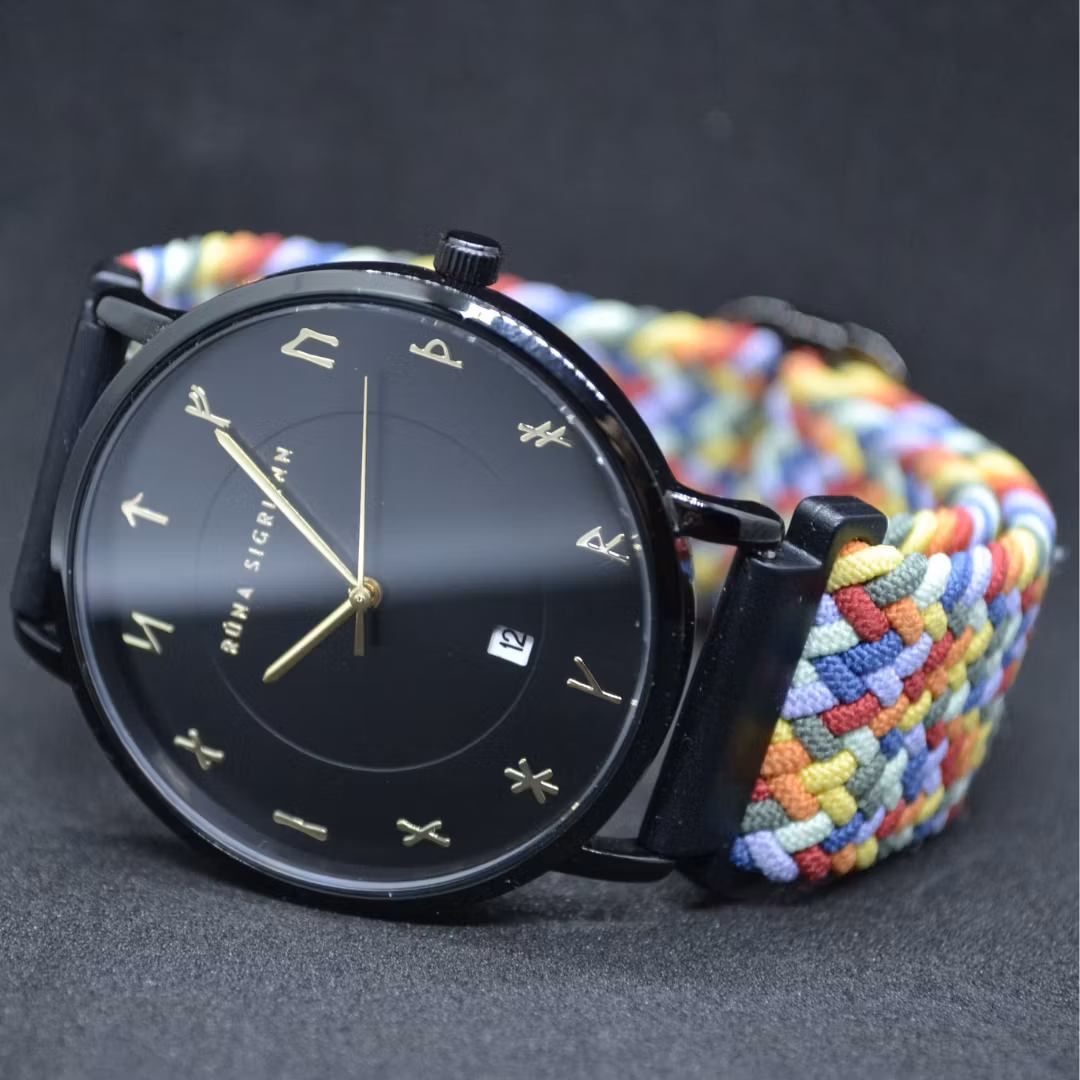 Fe Draupner har en minimalistisk nordisk design i blankt nattsvart med en slät glasskiva. Dess urtavla bär gyllene visare och runor som symboliserar Gyllentalen