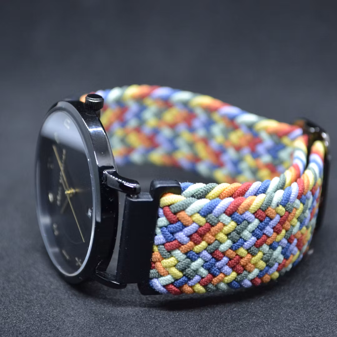 Det färgglada armbandet är det första folk lägger märke till — djärv, färgglad, och designad för att stå ut på håll. Genom att vara stretchig, luftig och skön förkroppsligar den klockans moderna uttryck samtidigt som den balanserar boettens och urtavlans tidlösa stillhet. Armbandet är vävt med elastiska nylontrådar för en skön och luftig känsla på handleden, och justeras enkelt med ett spänne utan att behöva knäppas. Armbandet kan enkelt tas av och bytas beroende på humör och smak.