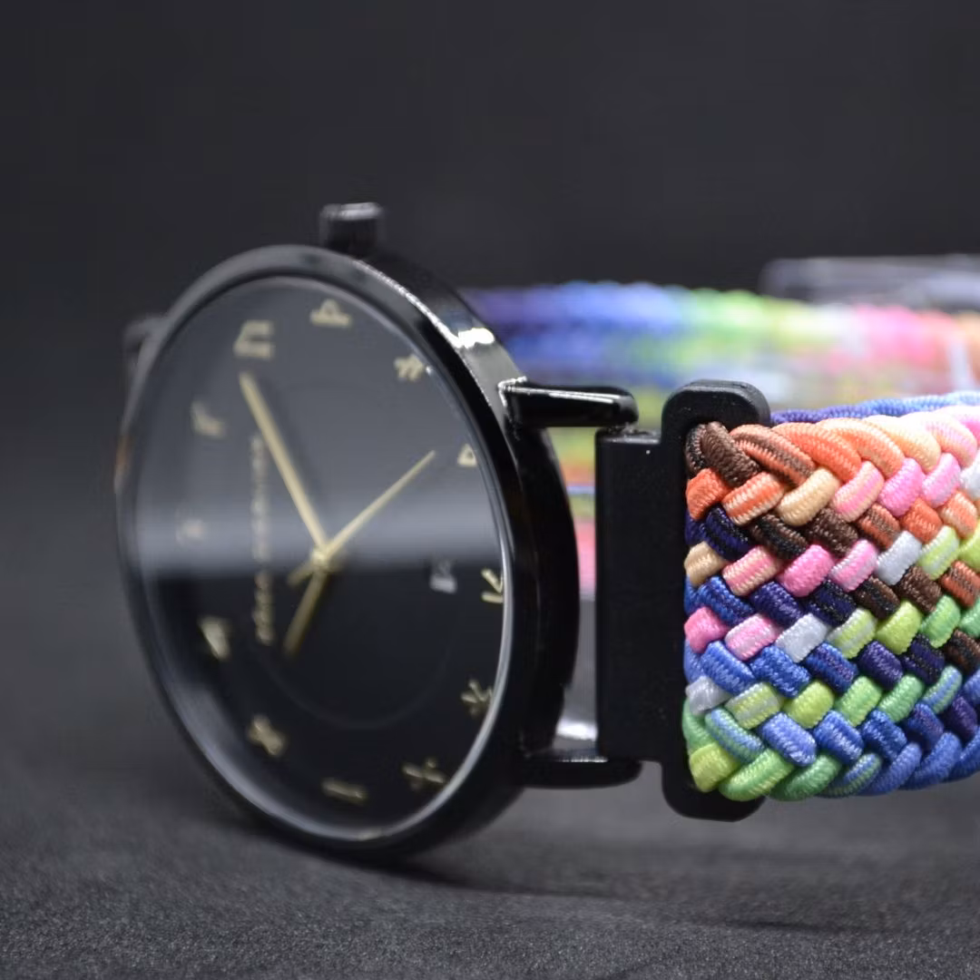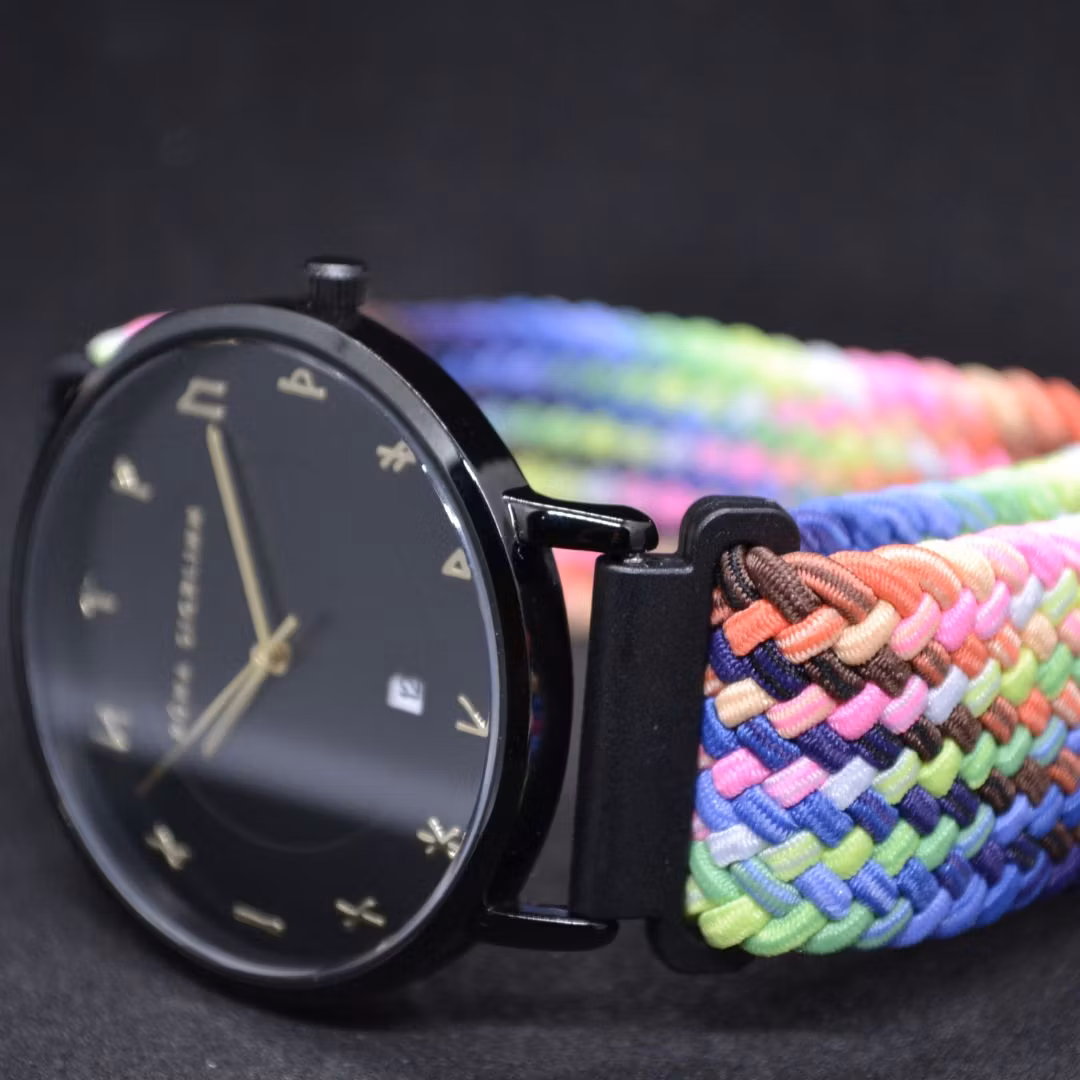 Det färgglada armbandet är det första folk lägger märke till — djärv, färgglad, och designad för att stå ut på håll. Genom att vara stretchig, luftig och skön förkroppsligar den klockans moderna uttryck samtidigt som den balanserar boettens och urtavlans tidlösa stillhet. Armbandet är vävt med elastiska nylontrådar för en skön och luftig känsla på handleden, och justeras enkelt med ett spänne utan att behöva knäppas. Armbandet kan enkelt tas av och bytas beroende på humör och smak.