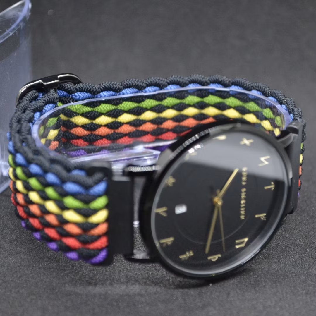 Det färgglada armbandet är det första folk lägger märke till — djärv, färgglad, och designad för att stå ut på håll. Genom att vara stretchig, luftig och skön förkroppsligar den klockans moderna uttryck samtidigt som den balanserar boettens och urtavlans tidlösa stillhet. Armbandet är vävt med elastiska nylontrådar för en skön och luftig känsla på handleden, och justeras enkelt med ett spänne utan att behöva knäppas. Armbandet kan enkelt tas av och bytas beroende på humör och smak.
